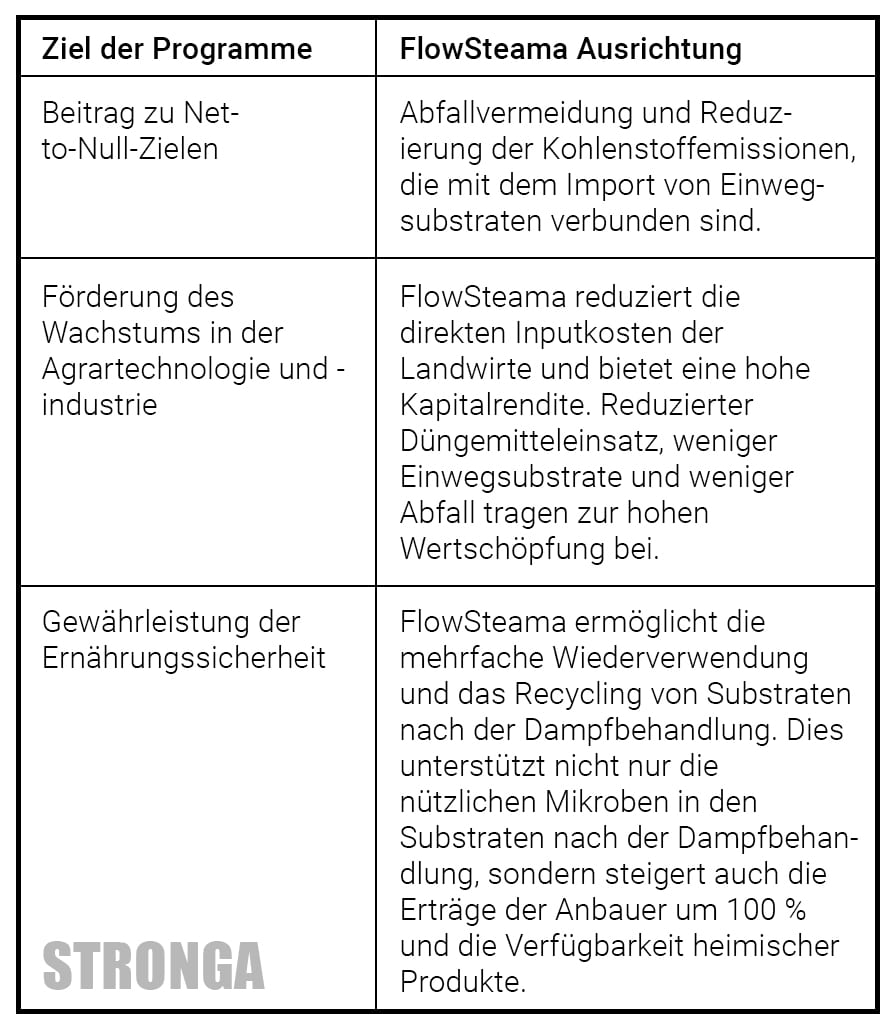 Die FlowSteama Anlage von Stronga entspricht den Grundlagen des EU-Obst- und Gemüseprogramms. Die Qualität des Anbausubstrats hat einen erheblichen Einfluss auf Ertrag, Produktivität und Qualität der angebauten Obst- und Gemüseprodukte. Beispiele für die Vorteile der Dampfpasteurisierung von FlowSteama im Einklang mit dem Programm sind in der folgenden Tabelle beschrieben.