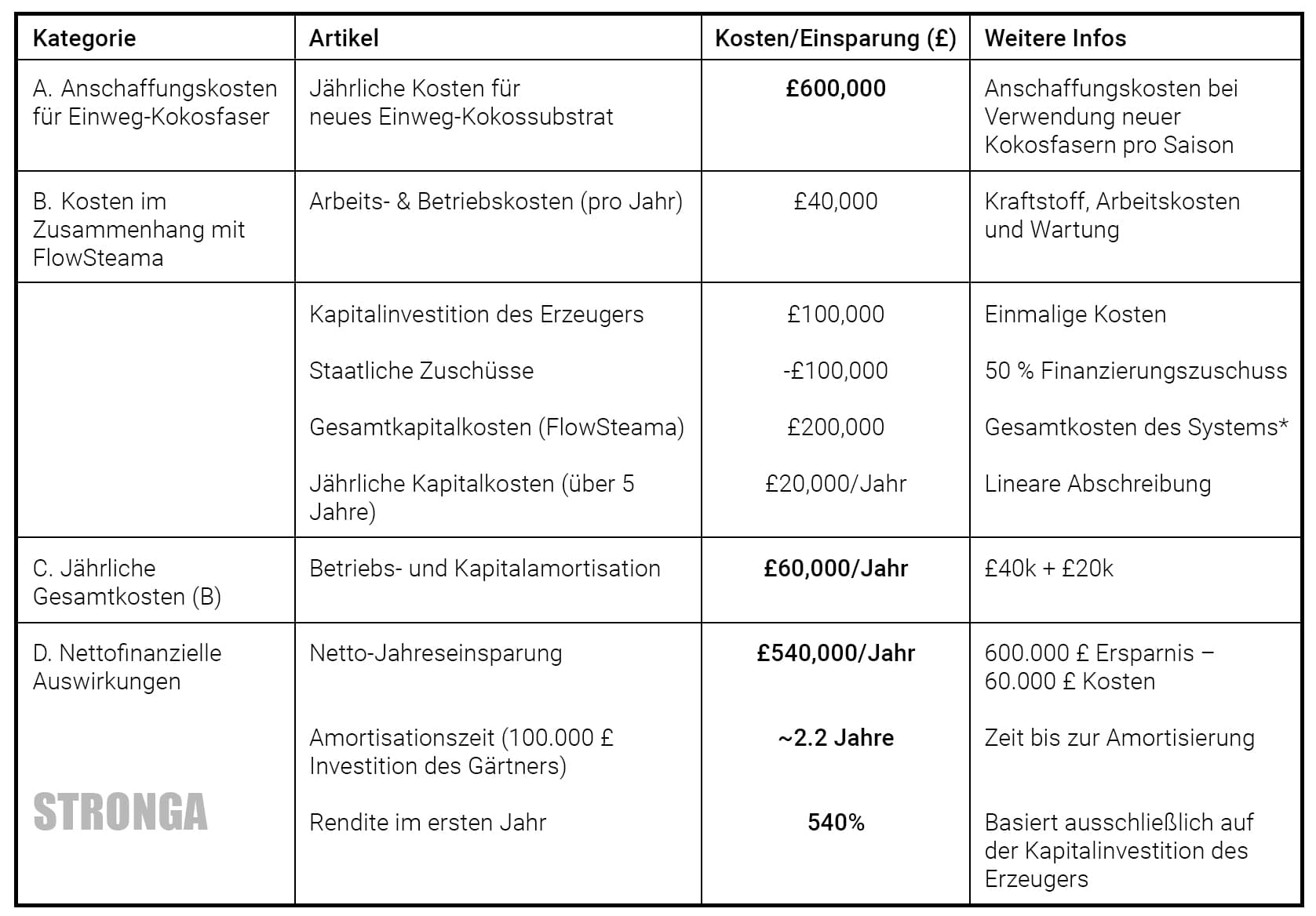Viele FlowSteama Besitzer haben ihre Anlagen erfolgreich über Förderprogramme erworben. So konnte beispielsweise ein Stronga Kunde mit einem großen Vorrat an gebrauchter Kokosfaser jährlich 600.000 £ an Anschaffungskosten für neue Kokosfaser einsparen, indem er FlowSteama zum Recycling des Materials nutzte. Die Anschaffungskosten der Anlage wurden ebenfalls kofinanziert, sodass der Gärtner einen erheblichen ROI erzielte. Die Tabelle zeigt die potenziellen Einsparungen bei der Verwendung von FlowSteama im Vergleich zum Kauf von Einweg-Substraten für jeden Wachstumszyklus.