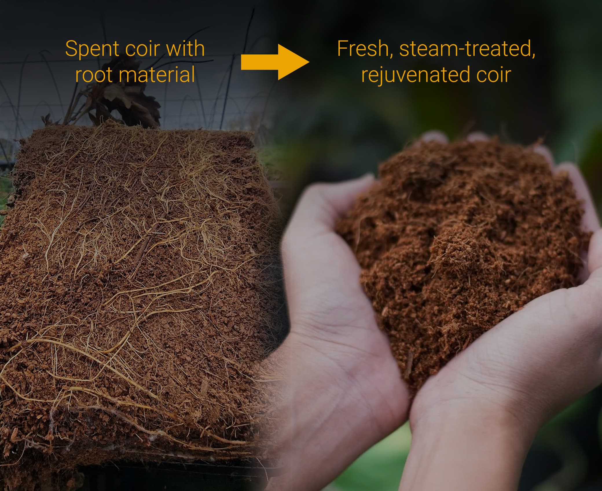 A typical pot of spent coir — containing root material and residual organic matter — represents significant underutilised value when discarded after one use. Following FlowSteama treatment, this material is transformed into a high-performance growing substrate, restored to optimal structure and moisture levels and ready to support healthy root development across multiple cropping cycles.