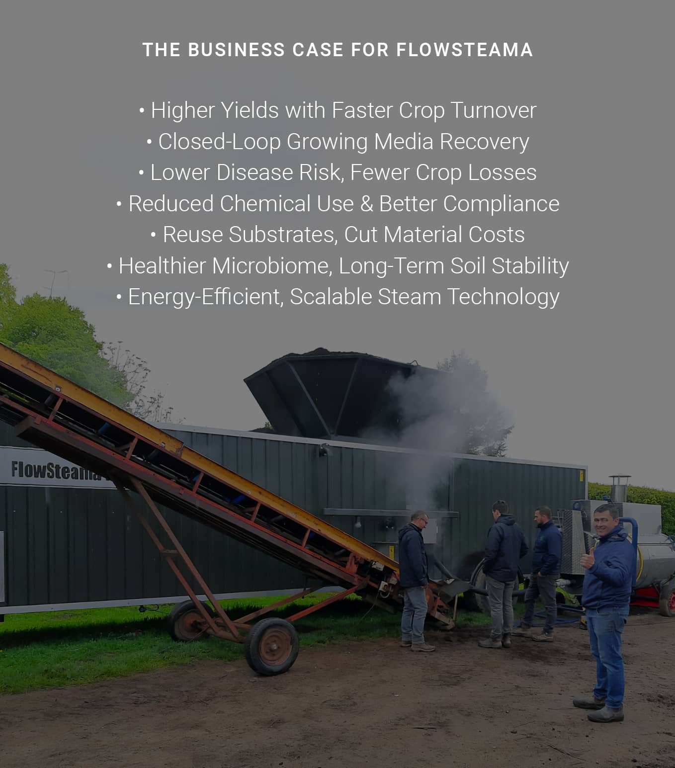 FlowSteama allows substrates (coir, peat etc.) to be safely reused by eliminating pathogens, weed seeds and pests, restoring a clean and consistent premium growing medium, reducing costs and waste, improving sustainability, and supporting stronger plant growth with a healthier microbial balance, significantly increasing profits.