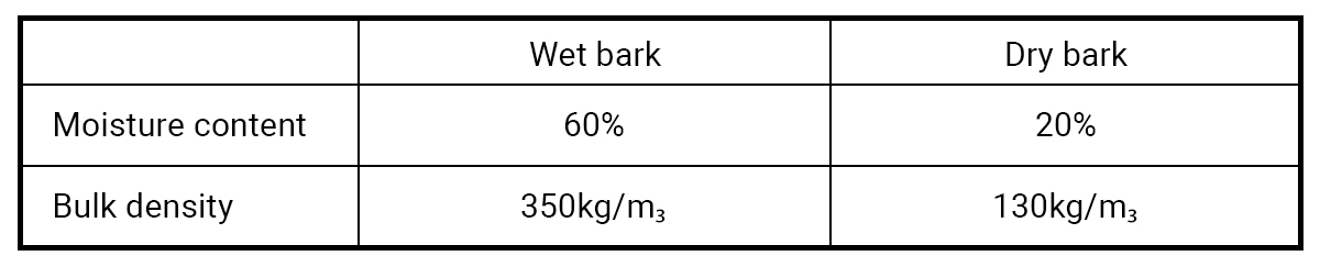 Wet bark: 120m₃ truck capacity x 350kg/m₃ wet bark = 42-ton overall load weight. More than one artic truck required.