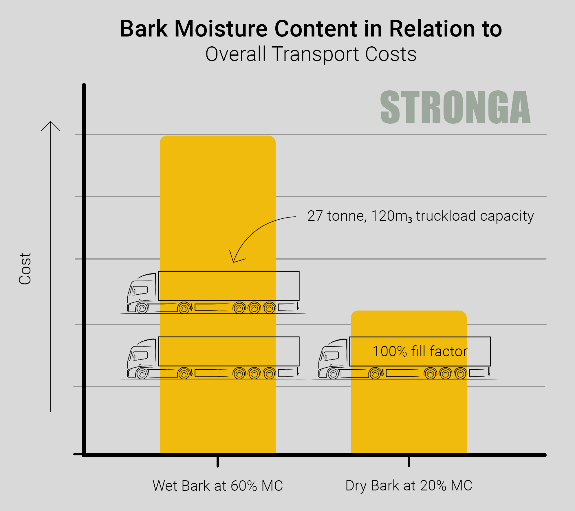 Fresh bark with a moisture content of 60-65% typically has a bulk density of circa 350-420kg/m₃*. In Europe, the maximum payload for a 3-axle artic lorry is approximately 27 tonnes, meaning the truck could only carry 77m₃ of wet material. The higher the moisture content of the bark, the less material can be transported in one truckload – this means more loads, more trucks, more fuel and more labour… all of which are only increasing in price due to inflation.