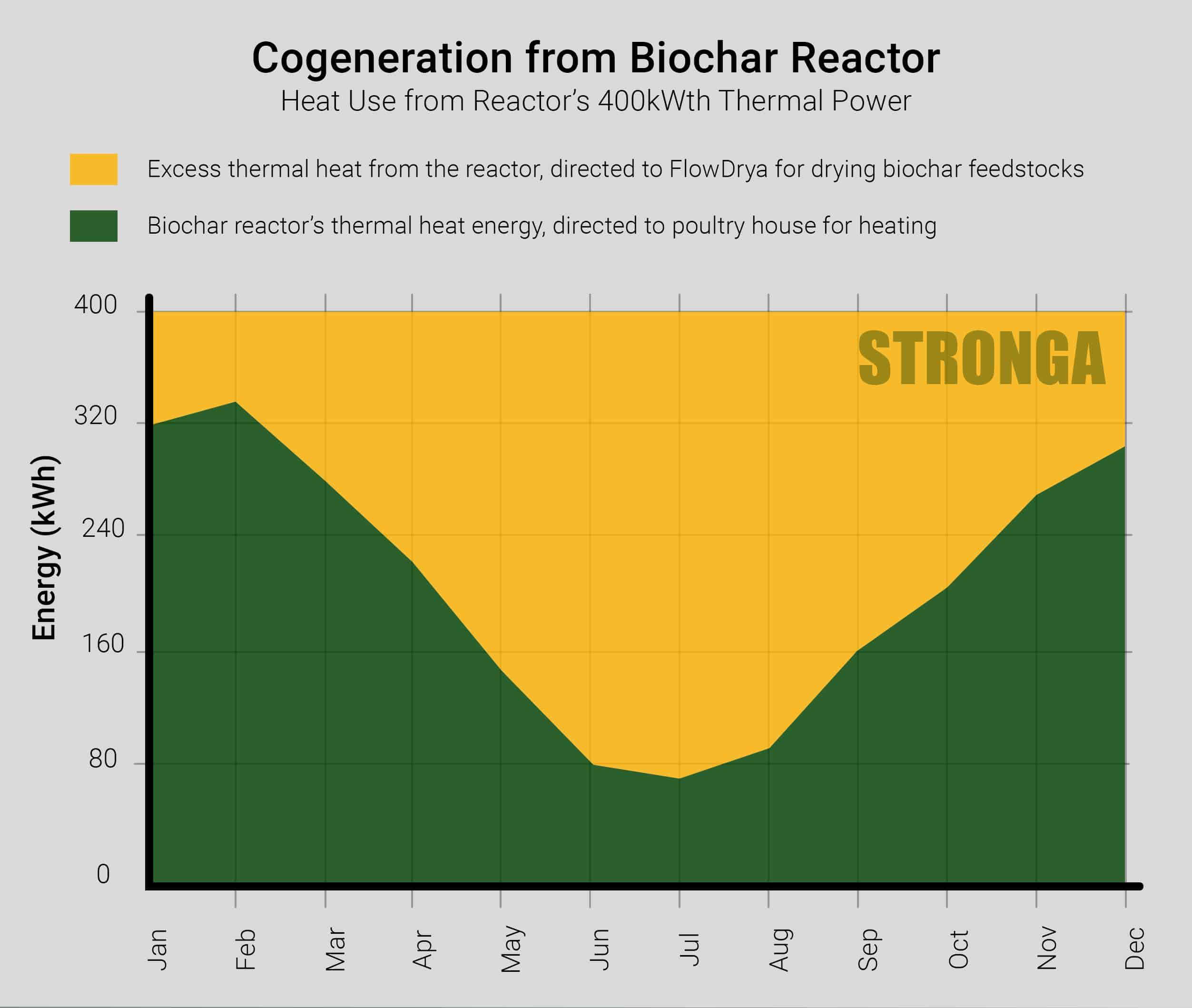 Kisebo invested in a Biomacon 400 biochar reactor capable of providing up to 400kWth of stable thermal energy in the form of hot water at 90°C, all year round. Seasonal heat load demand in the poultry house means residual heat can be utilised for a secondary application… drying the biochar feedstock. In the warmer summer months, all 400kWth is potentially available for drying woodchip. FlowDrya balances heat utilisation for the primary heat use, the poultry house; and secondary heat use, drying of the feedstock, so in total, all the heat is fully utilised. Nothing is wasted.