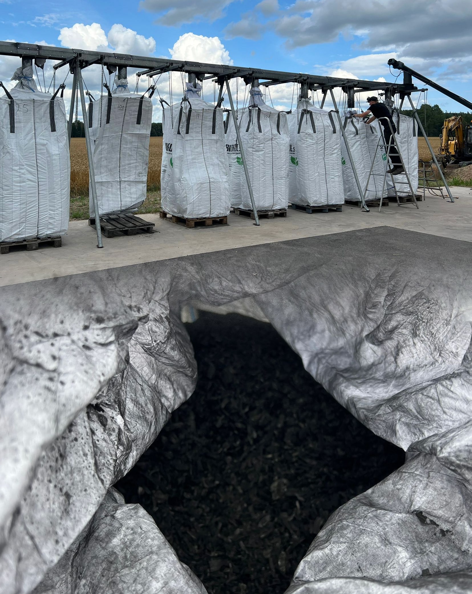 Efficiently using all the thermal energy available means the farm now has the benefit of producing biochar in addition to their already successful poultry business. Biochar production brings with it carbon capture/storage opportunities, enabling Kisebo Lantbruk AB to join the carbon credit market as well as sell the bagged biochar (see below), derived from dry, FSC certified pine woodchip.