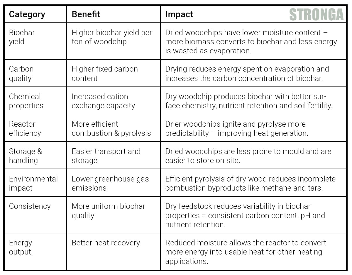 FlowDrya optimises biochar production, delivering dry, conditioned woodchip feedstock to the reactor. Learn the importance of drying biochar feedstocks in the table below.