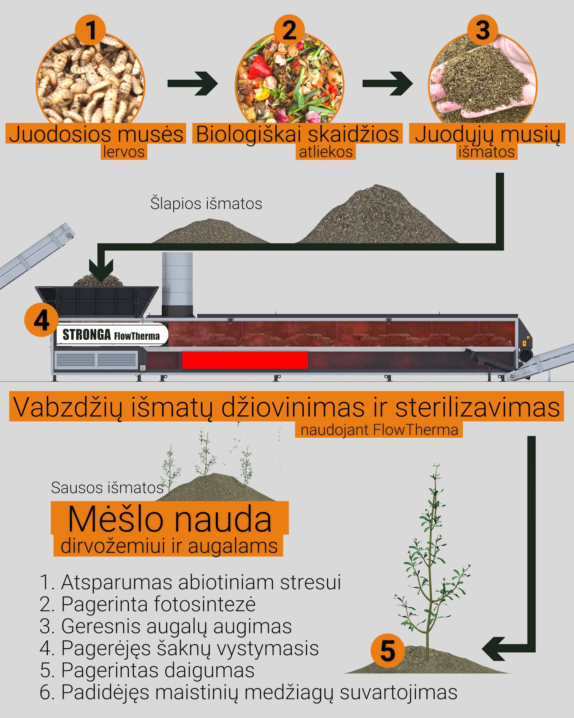(1) Juodosios plokščiamusės auginimas; (2) Juodosios plokščiamusės lervų auginimas; (3) Lervos vartoja maistą / organines atliekas (iš kurių iki 40 % visame pasaulyje išmetama); (4) Jos paverčia atliekas maistinių medžiagų turtingomis išmatomis; (5) Lervos atskiriamos nuo išmatų – produktai yra vabzdžių baltymai (gyvulių pašarai) ir išmatos (trąšos); (6) Žaliava, tinkama pasterizuoti ir granuliuoti naudojant FlowTherma, parduodama kaip trąšos.