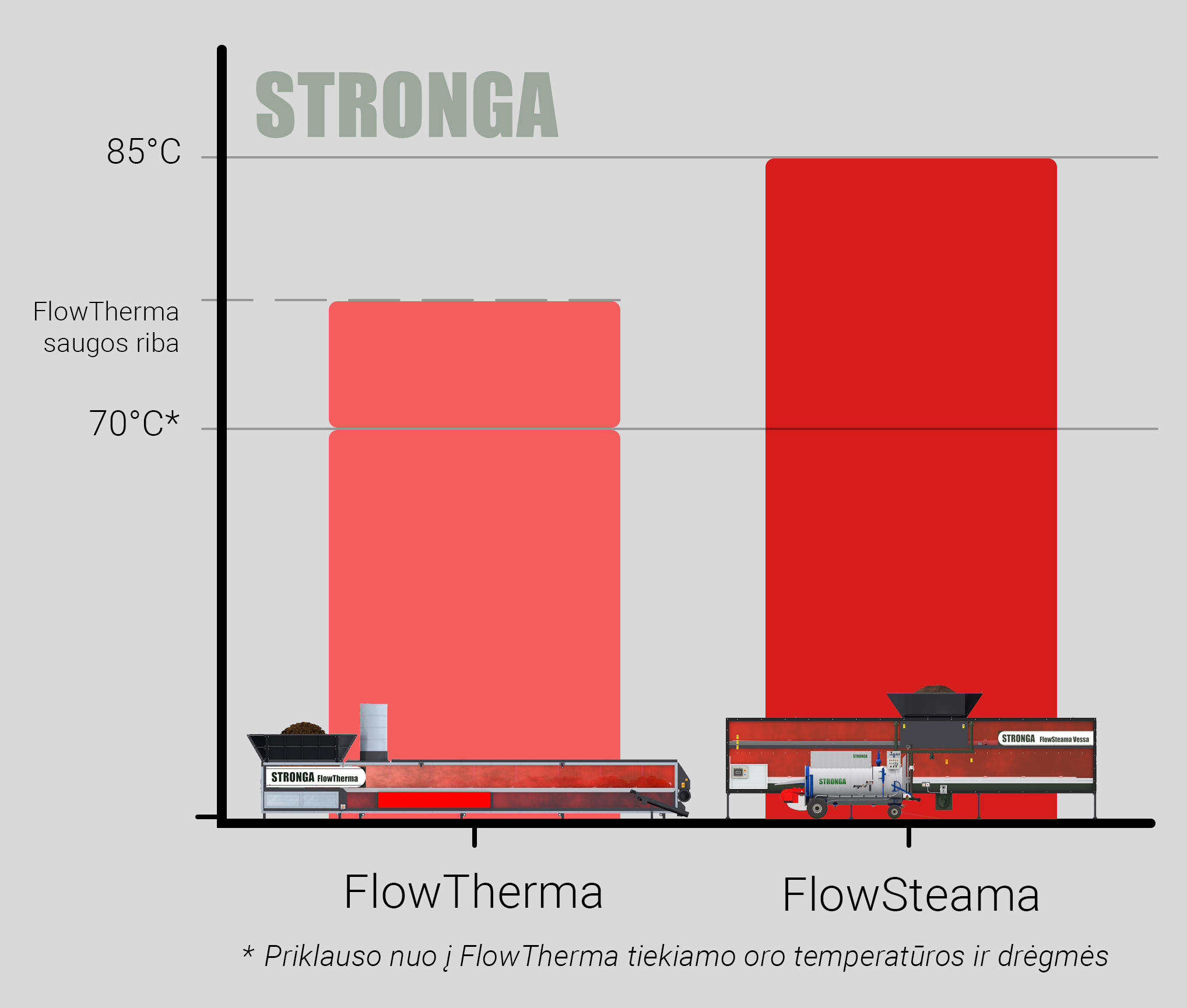 Stronga FlowTherma yra daugiafunkcinė sauso kaitinimo, džiovinimo ir pasterizacijos sistema. Terminio apdorojimo ir džiovinimo procesas užtikrina bendrą drėgmės ir patogenų pašalinimą, todėl gamintojai gali laikytis ES reglamentų.