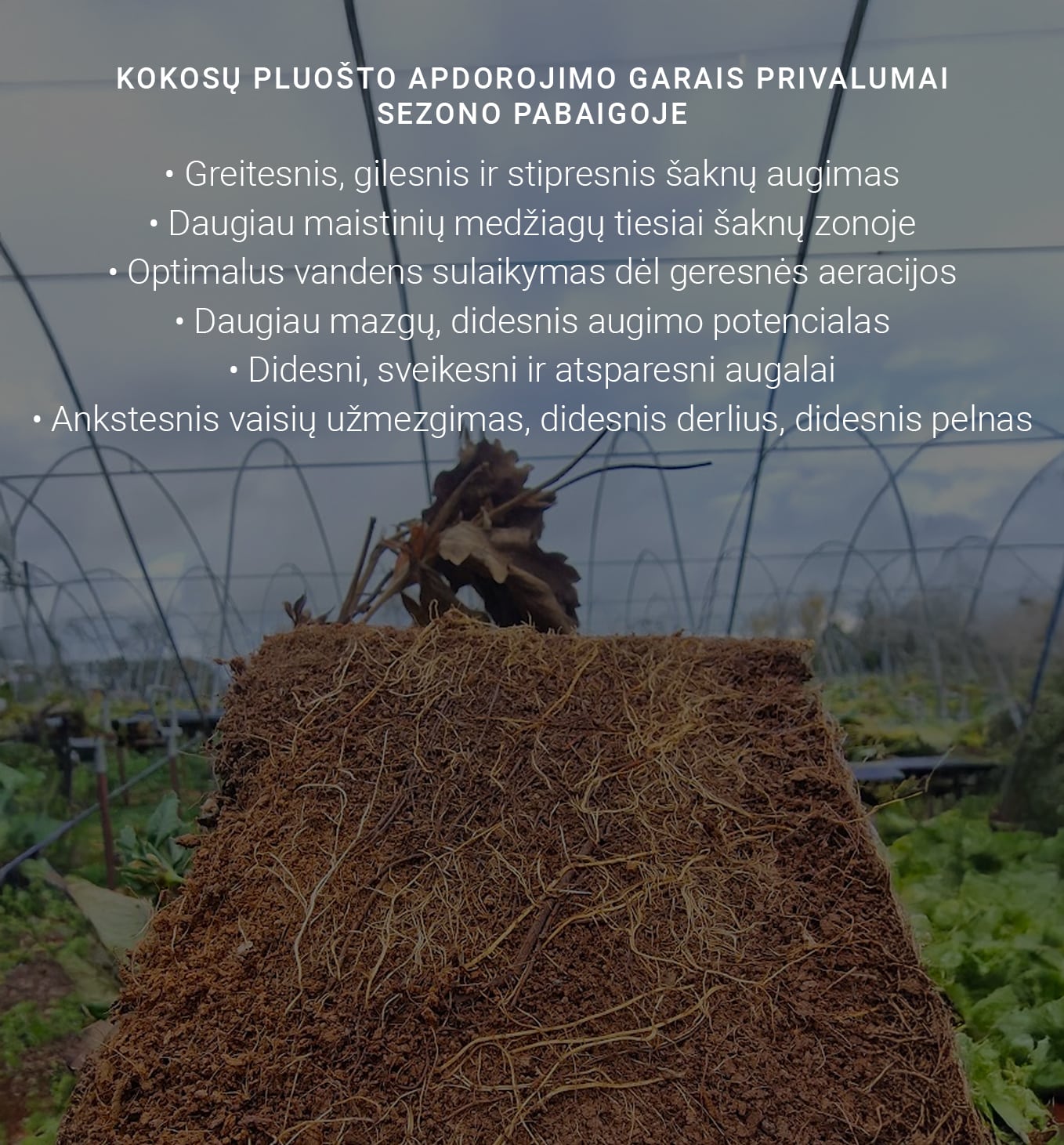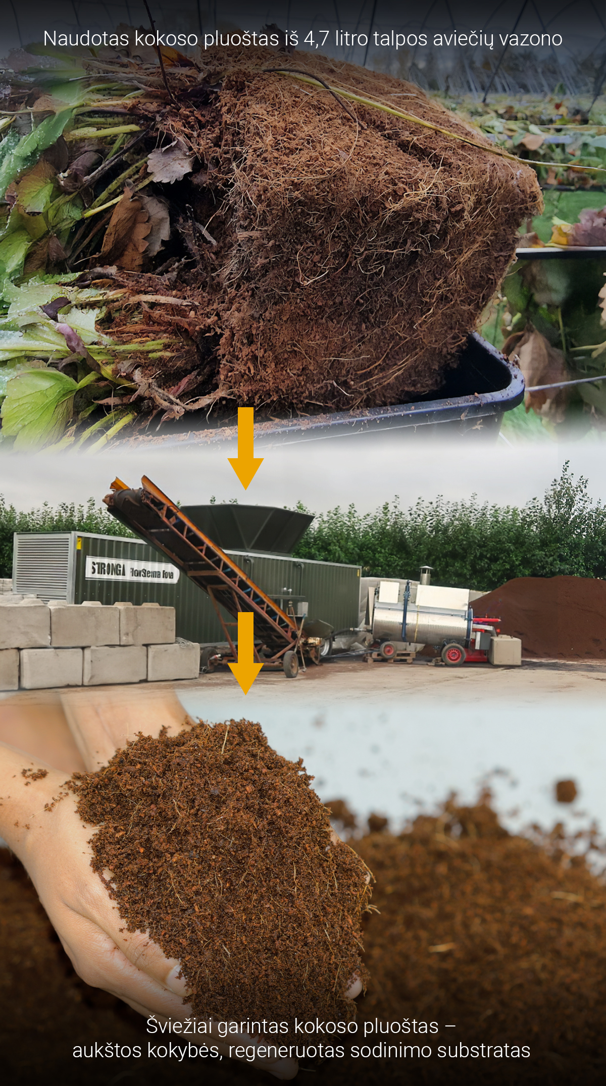 Garais apdoroto, sezono pabaigoje kompostuoto kokosų pluošto substrato privalumai uogų augalams