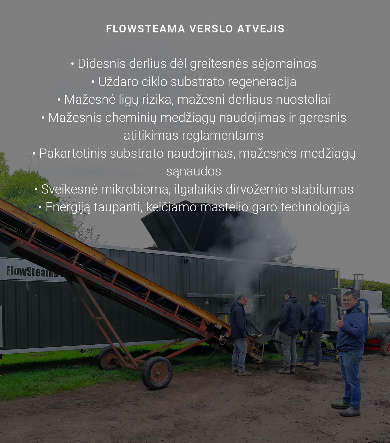 Stronga garų apdorojimo sprendimai siūlo tvarų ir unikalų požiūrį į auginimo substratų optimizavimą ir perdirbimą. Derindamas tikslų temperatūros valdymą ir efektyvų energijos naudojimą, FlowSteama procesas ne tik kontroliuoja ir riboja kenksmingus patogenus, bet ir sukuria optimalias sąlygas naudingų mikroorganizmų augimui. Rezultatas – sveikesnis dirvožemis ir substratai, stipresni augalai ir atsparesni pasėliai. Galiausiai, garų apdorojimas yra daugiau nei procesas – tai investicija į natūralaus potencialo išlaisvinimą ilgalaikiam produktyvumui ir tvarumui auginant.