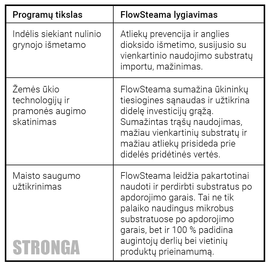Stronga FlowSteama įrenginys atitinka ES vaisių ir daržovių programos principus. Auginimo substrato kokybė daro didelę įtaką auginamų vaisių ir daržovių produktų derliui, produktyvumui ir kokybei. FlowSteama garų pasterizacijos pagal programą naudos pavyzdžiai aprašyti toliau pateiktoje lentelėje.