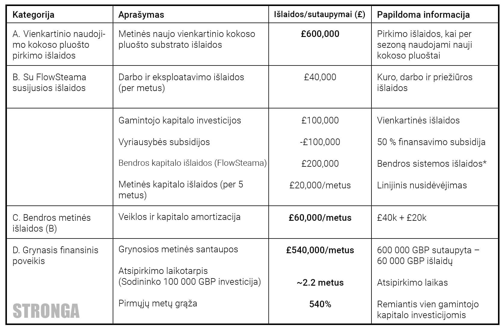Daugelis FlowSteama savininkų sėkmingai įsigijo savo sistemas pasinaudodami subsidijų programomis. Pavyzdžiui, vienas Stronga klientas, turintis dideles panaudoto kokoso pluošto atsargas, kasmet sutaupydavo 600 000 svarų sterlingų naujo kokoso pluošto pirkimo išlaidų, naudodamas FlowSteama medžiagai perdirbti. Sistemos įsigijimo išlaidos taip pat buvo bendrai finansuojamos, todėl augintojui buvo suteikta didelė investicijų grąža. Lentelėje parodytas galimas sutaupymas naudojant FlowSteama, palyginti su vienkartinių substratų pirkimu kiekvienam augimo ciklui.