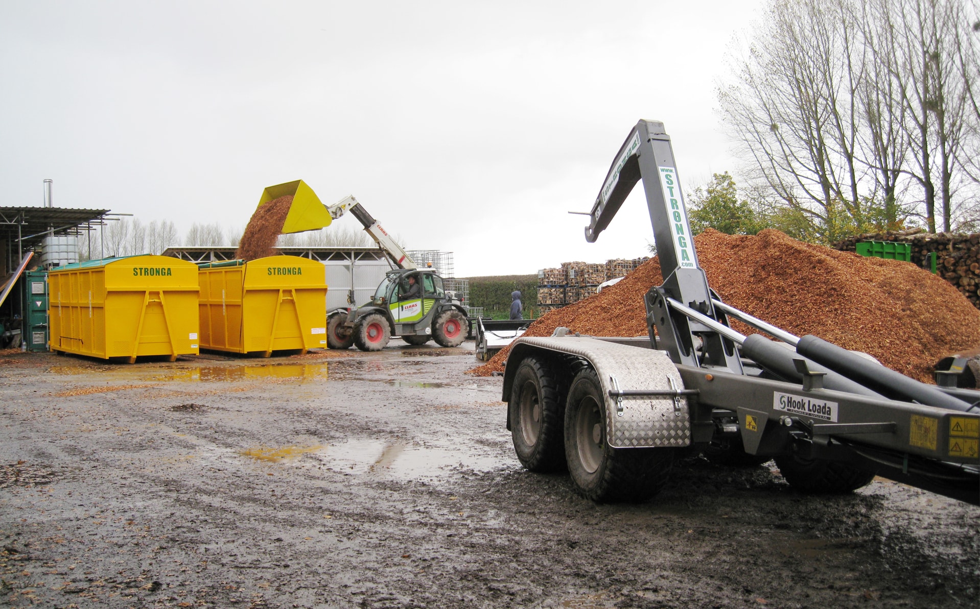 (2) Verzamelen, drogen en leveren. Met behulp van HookLoada kunnen gebruikers nat materiaal bij de bron ophalen, leveren aan het droogstation, aansluiten op Heatex en de uiteindelijke droge output aan de eindgebruiker leveren.